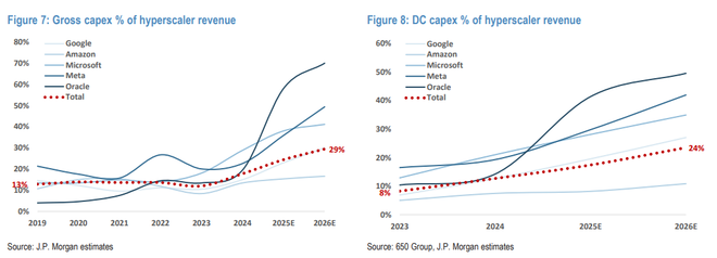 从绝对金额来看,2025年相比2024年的增量支出将超过1150亿美元,这一数字显著高于2024年750-800亿美元的同比增量。值得注意的是,这1150亿美元的增量支出已经基本涵盖了英伟达、AMD、博通和Marvell四家公司今年预期的AI相关GPU/ASIC和网络设备的增量营收总和(850亿美元以上)。