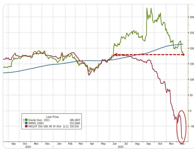 对于二级市场投资者而言,这笔融资的意义远超OpenAI本身,它直接关系到甲骨文等关键供应商的资产负债表健康。此前,市场普遍担忧OpenAI无法产生足够的收入来支付其对Oracle和CoreWeave等公司的巨额算力基础设施承诺。这种担忧导致Oracle被巴克莱银行下调债务评级,其信用违约互换(CDS)价格一度飙升至约156个基点的16年高位,市场甚至开始定价其未来5年的破产风险。