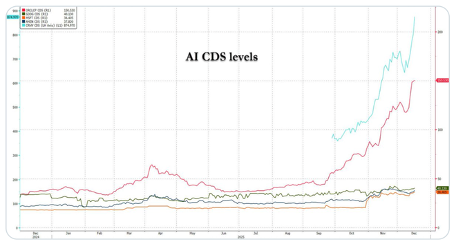 市场对人工智能行业融资能力的质疑迅速蔓延至OpenAI的合作伙伴。由于分析师开始计算人工智能周期需要数万亿美元的债务,CoreWeave和甲骨文等信用评级较弱的公司债券和股票价格暴跌,其五年内破产的可能性飙升,导致它们的信用违约互换 (CDS) 达到历史最高水平。![]()