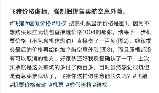 另一位用户则透露了更深层次的价格欺诈:“搜索机票显示价格是1004元,结果下一步机票价格直接贵了一百多,最后再给你加个航空意外险,而且压根都没有可以取消的地方……飞猪你这样做生意能长久吗?”