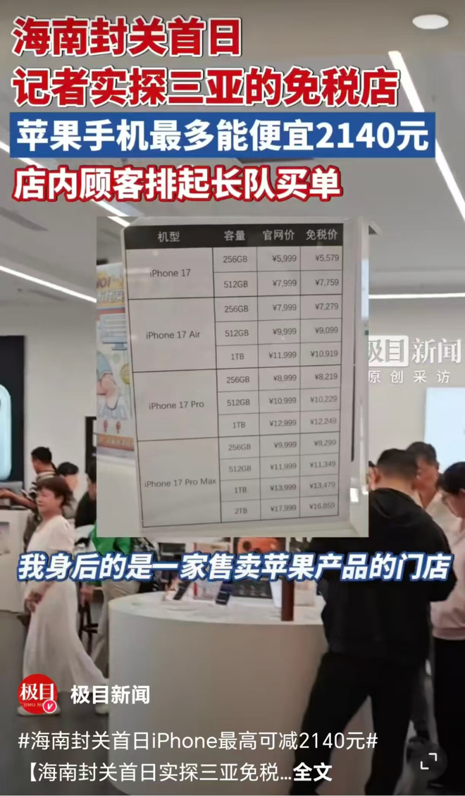 在三亚海旅免税城,苹果产品门店前也排起长队。iPhone 17 Pro Max 2TB顶配版,官网售价17999元,海南的免税价为16859元,在此基础上还能叠加使用“满15000元减1000元”的免税消费券,最终到手价仅为15859元,比官网便宜2140元。即便是iPhone 17 256GB版本,免税价也比电商平台便宜420元。