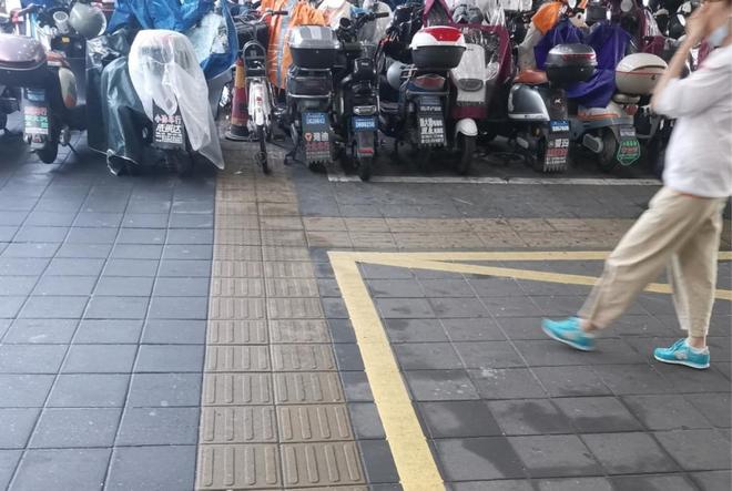 检察官在现场看到,在车流人流交织的繁华路段,近100米长的盲道被共享单车和电动车等非机动车违规停放占用,部分盲道被石球和金属路障隔断;另一处非机动车停放点附近,部分非机动车停放于停车线外,有约5米盲道被电动车违规停放占用,导致这些路段盲道无法正常通行,过往行人只能小心翼翼穿梭其间。