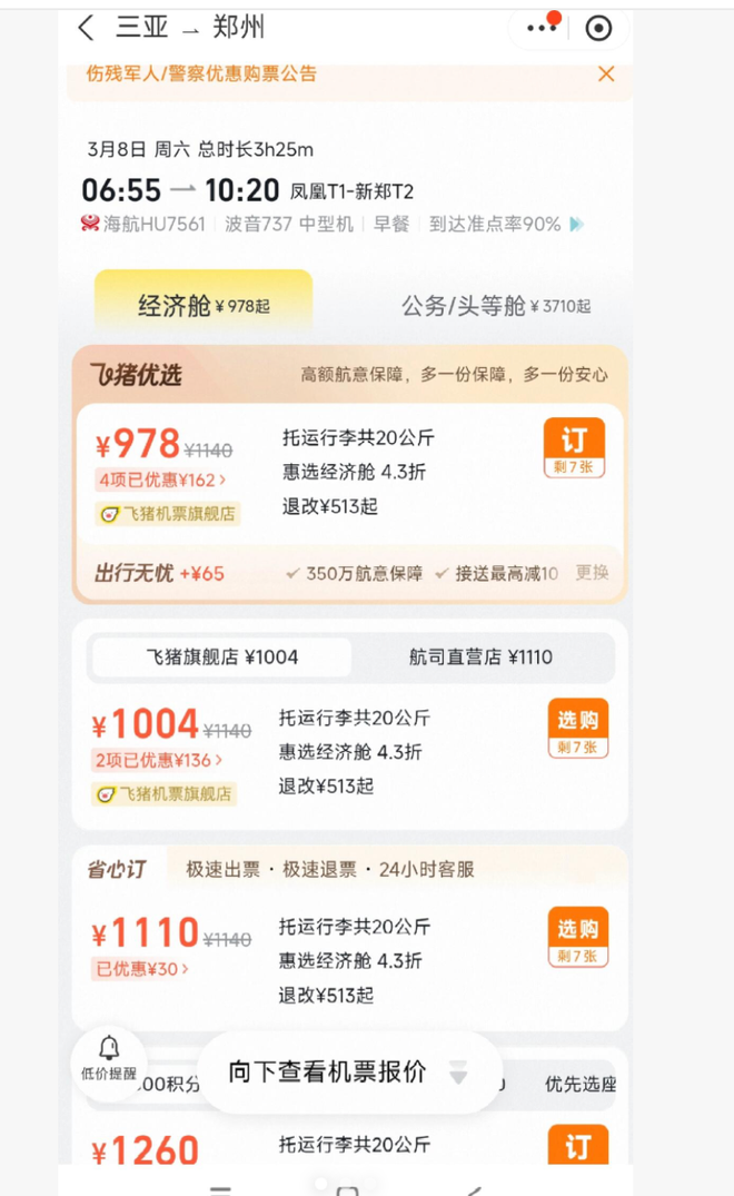 另一位用户则透露了更深层次的价格欺诈:“搜索机票显示价格是1004元,结果下一步机票价格直接贵了一百多,最后再给你加个航空意外险,而且压根都没有可以取消的地方……飞猪你这样做生意能长久吗?”