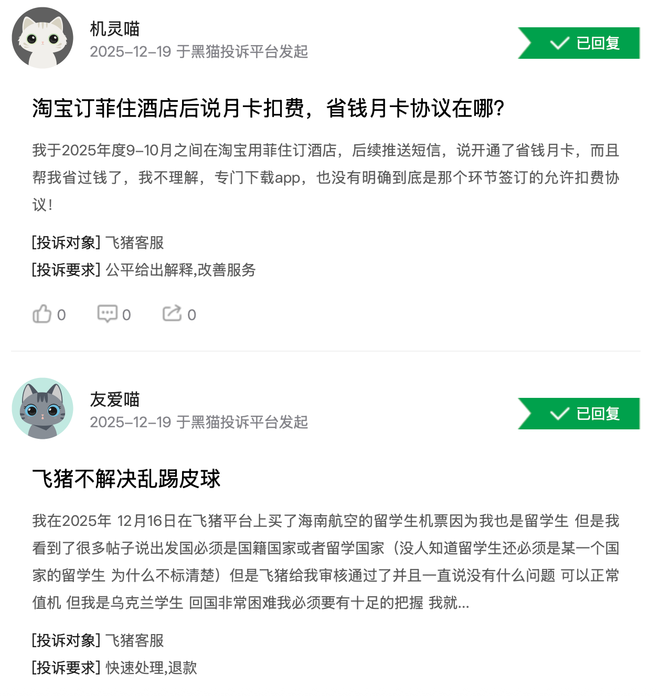 截至12月19日,在黑猫投诉平台上,针对“飞猪”的投诉量已高达114489条。这些投诉集中指向乱定价和退费不合理等核心痛点,而其中备受争议的“大数据杀熟”问题,更是成为了用户流失的焦点,让老用户寒心。