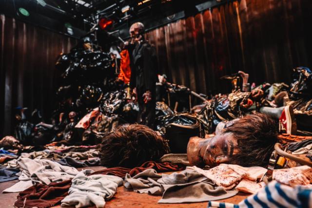 《小丑盖里》延续古罗马战场凶杀、强奸、肢解、食人等暴行,藉以复活的小丑“盖里”,以血腥循环的荒诞叙事探讨暴力、权力与社会割裂,映射当代美国的社会矛盾。在肮脏戏谑中直面绝望,泰勒·麦克宣言称:此剧为“一声尖叫,为了记住我们还有尖叫的能力”,穿透时空界限的同时,确也与时代共生。该剧2019年在百老汇首演后引发“尖锐直击现实”的争议和轰动。剧中将行尸走肉的场面推向极致,房间中央的桌子有时作为高台堆放血迹斑斑的尸体,堆砌在14尺高木架上形同沙袋的灰色尸体,双腿张开甚至裸露着生殖器被覆盖、丢弃,穿绕楼道叠放。