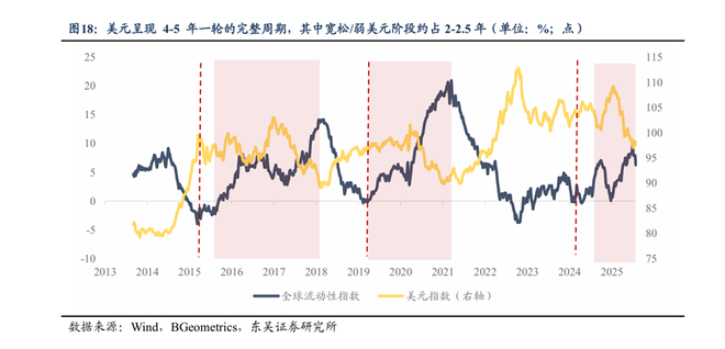 这一判断的核心逻辑在于全球流动性拐点与产业趋势的共振。东吴证券分析显示,全球流动性宽松与弱美元周期通常持续2至2.5年,本轮周期始于2024年三季度,预计将延续至2026年二季度。上半年,美联储降息叠加其独立性可能面临挑战,将推动美元走弱,利好新兴市场成长风格。然而进入下半年,随着降息及减税政策滞后效应显现,加之临近美国中期选举,美元或转向走强,从而对全球资产定价产生影响。