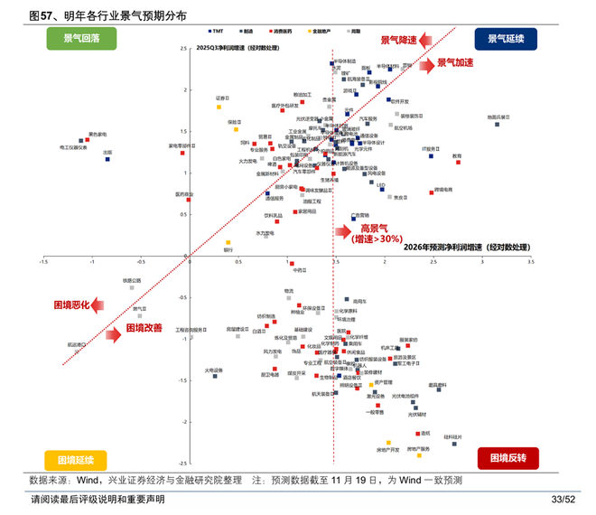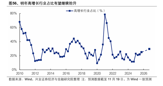 基于当前的一致预期及行业调整系数,兴业证券测算2026年全A非金融净利润增速将从2025年的6.5%大幅回升至16.5%,重回两位数增长区间。此外,参考历史经验,五年规划的第一年往往是周期大年,传统周期板块有望在价格回升、需求刺激等多重因素共振下演绎出强力行情。