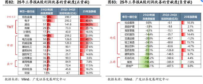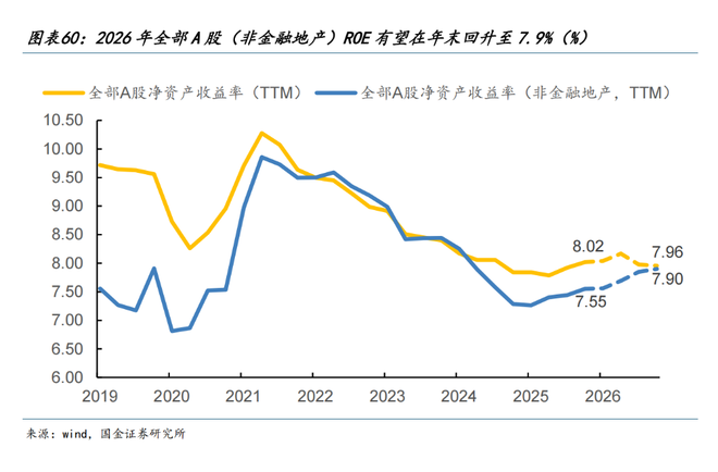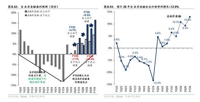 在具体的财务数据预测上,申万宏源对2026年的企业盈利表现持乐观态度。报告预测,2025年和2026年全A两非归母净利润同比增速分别为7%和14%。其中,2025年的增长主要由低基数效应贡献,而2026年的两位数增长则源于盈利能力的实质性有效改善。