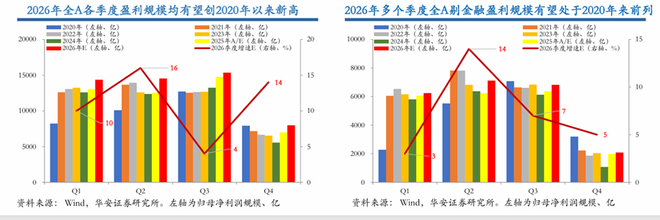 创业板和科创板受益于新一轮产业周期,预计将维持高增速水平。其中,创业板2026年盈利增速有望达到31.7%,科创板盈利增速预计为34.3%。从盈利节奏看,全A盈利规模预计在2026年各季度均创2020年以来新高。