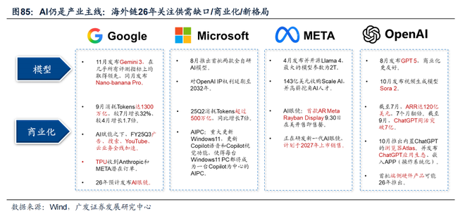 在AI领域,报告认为AI仍是核心产业主线。海外链条方面,2026年应关注供需缺口(如光芯片、铜箔、电力)、商业化落地及新竞争格局(如Google链拉动、国内企业切入海外液冷/电源供应链)。国内方面,随着DeepSeek等技术突破,大厂资本开支提速,算力需求反弹与端侧创新机遇值得重视,2026年或将成为大厂端侧硬件产品的元年。