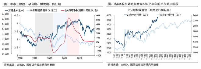 根据国信证券的复盘,一轮完整的牛市通常包含孕育期、爆发期和疯狂期三个阶段。本轮牛市自2024年9月24日启动以来,其初期特征与历史上的“519”行情更为相似,目前正处于向“第二阶段”(爆发期)过渡的关键时点。