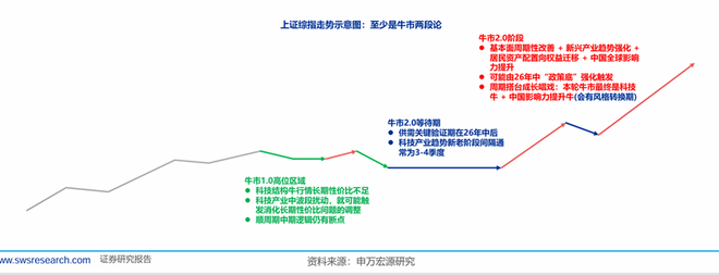 申万宏源证券傅静涛团队在11月17日发布的报告中认为,当前的A股行情可划分为两个阶段:现阶段至2026年春季为“牛市1.0”的科技结构牛,而2026年下半年可能启动“牛市2.0”阶段,届时随着基本面周期性改善、新兴产业趋势强化以及居民资产配置迁移,市场有望迎来全面牛市。