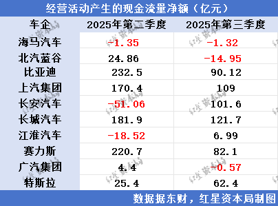 财报数据显示,2025年第三季度,海马汽车、北汽蓝谷和广汽集团的经营活动产生的现金流量净额为负数。