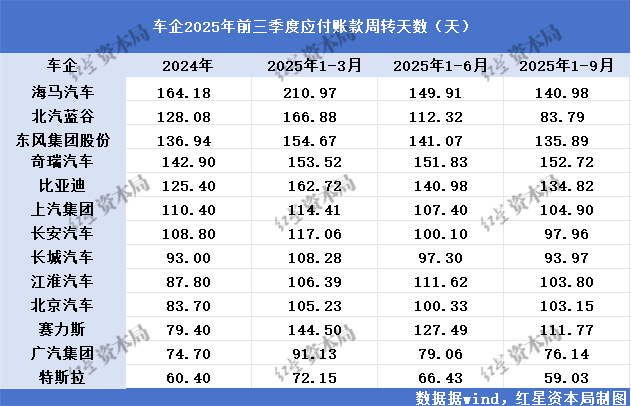 根据13家乘用车上市公司公布的2025年三季报,红星资本局梳理发现,应付账款周转天数普遍呈下降趋势。