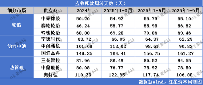 2025年前三季度,中策橡胶(603049.SH)、赛轮轮胎(601058.SH)、玲珑轮胎(601966.SH)的应收账款周转天数分别为55.1天、56.5天、69.5天,与上半年的数据基本持平。这三家轮胎企业的应收账款及应收票据金额都较上半年有所增长。