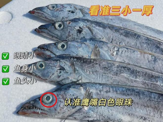 再给大家说说如何辨真假!认准「三小一厚」,鱼眼小、鱼身小、鱼头小,这才是正宗舟山小眼带鱼。