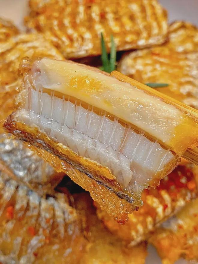 带鱼去内脏切段,姜、白酒、花椒腌制,煎至定型,翻面再煎制金黄即可,肉多刺少,一天三顿都不腻~