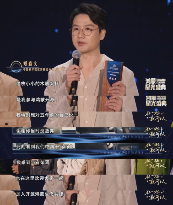 而中科院90后工程师郑森文手中的那座木质奖杯,则静静见证着鸿蒙从一株“小苗”长成参天“大树”的五年征程。