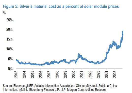 摩根大通Gregory C. Shearer分析师团队认为,白银年内近130%的涨幅,已将其在太阳能组件总售价中的成本份额从2024年以前通常低于5%的水平,大幅推高至近20%。这严重挤压了光伏组件制造商本已“微薄”的利润空间。高昂的成本正迫使行业加速“节银”(thrifting),即通过技术手段减少银的使用。