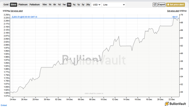 根据BullionVault周一发布的数据,金银价格的年度涨幅为46年来之最。截至年底仅剩几个交易日,黄金年内涨幅已接近70%,白银更是飙升近140%。