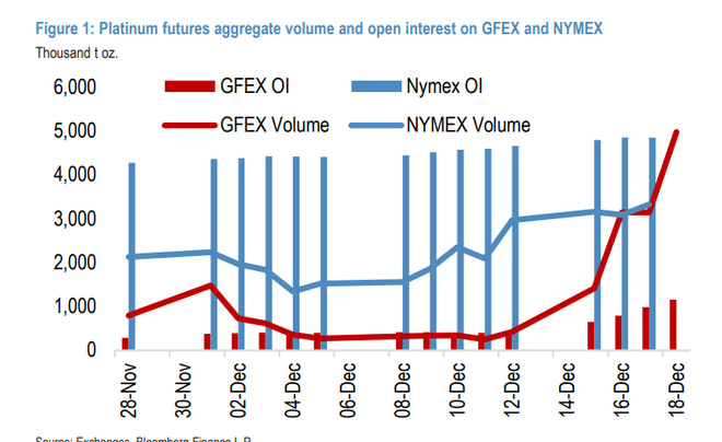 在铂金的惊人涨势背后,来自中国的交易活动起到了助推作用。摩根大通在12月18日的报告中指出,铂金价格从每盎司1700美元区间跃升至1900美元以上,主要驱动力似乎是中国广州期货交易所(GFEX)“强劲的”期货交易活动和持仓量激增。