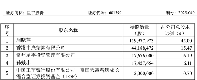 据星宇股份(601799)12月12日披露的前十大股东持股情况,截至12月10日,富国基金朱少醒管理的富国天惠精选成长混合继续保持在前十大股东之列,但持股数量较今年三季度末时减少了100股。