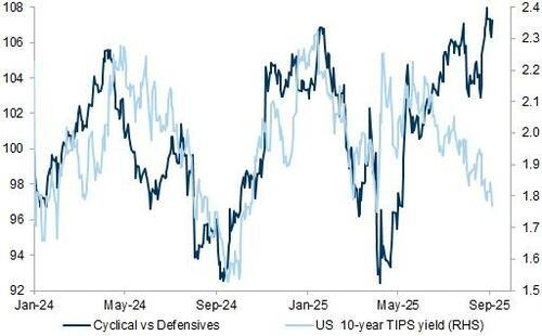 他认为,市场对领先和滞后指标的解读将决定未来12个月的投资成败。当前,周期性与防御性板块的表现出现明显背离,美国10年期通胀保值债券(TIPS)收益率与板块表现的错位达到两年来最大。