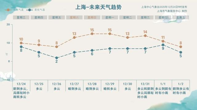 受不断补充的冷空气影响,周四和周五(25日和26日),上海以多云天气为主,气温继续下行。周五气温最低,早间中心城区最低气温2℃左右,郊区多在冰点以下。回暖也很迅速,双休日和下周初天气晴好,白天气温迅速回升,最高气温在13~15℃左右。