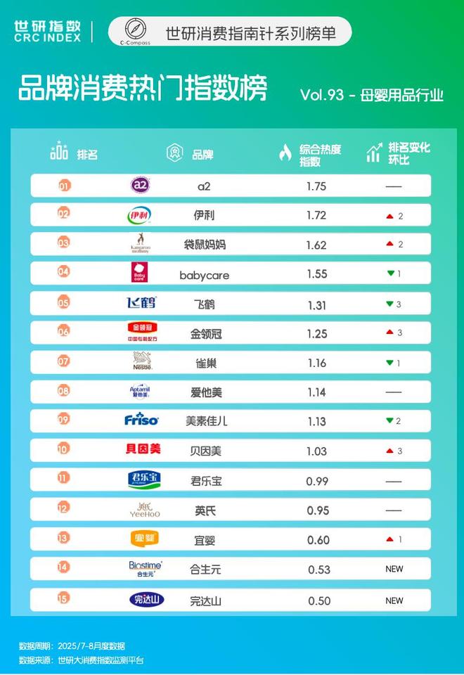 本次监测周期内,a2、伊利和袋鼠妈妈分别以1.75、1.72和1.62的综合热度指数位列榜单Top3。
