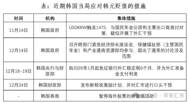 韩国财政部宣布了一项新的措施,计划为出售海外股票并将资金汇回国内进行长期投资的个人投资者提供资本利得税减免,以引导韩元资金回流。韩国央行方面,近期也重启了与国民年金公团的货币互换协议(约650亿美元),并决定减免外汇稳定税(对银行等金融机构外汇负债征收)及向金融机构持有的法定外汇存款准备金支付利息,增强韩国金融体系对海外资金的吸引力。