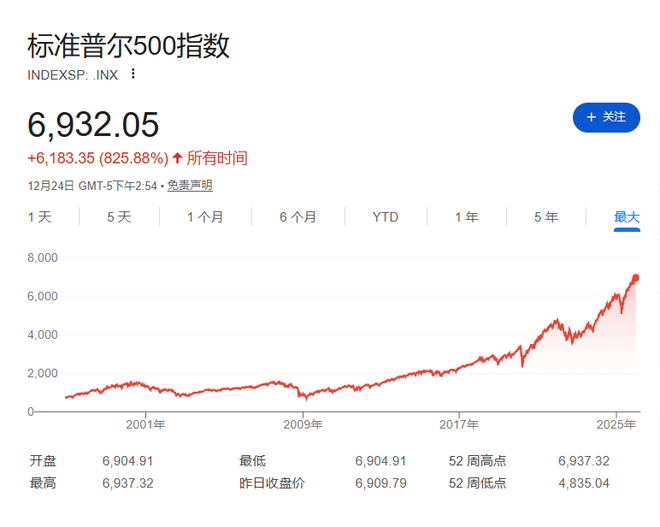 12月24日美股因假期因素提前收盘,截至收盘,标普500指数上涨0.3%,收于6932.05点;道琼斯工业平均指数表现更佳,上涨0.6%,收于48731.16点,同样创下收盘新高。科技股为主的纳斯达克综合指数微涨0.2%。与此同时,衡量市场恐慌情绪的CBOE波动率指数(VIX)收于14以下,为2025年12月以来的首次,显示市场整体波动性较低。