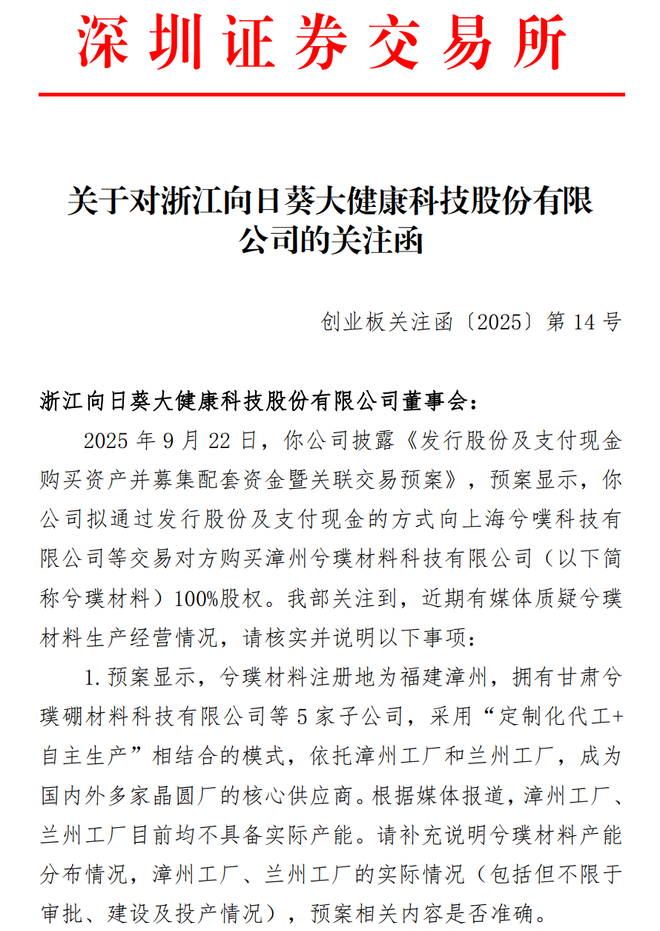 深交所要求向日葵就上述事项做出书面说明,在2025年12月29日前将有关说明材料报送深交所创业板公司管理部,同时抄送浙江证监局上市公司监管处。