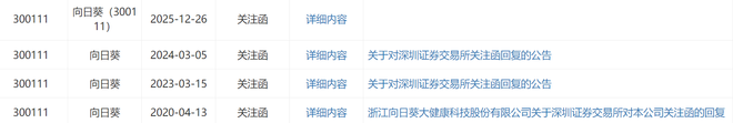 值得注意的是,此前几年,向日葵多次收到深交所关注函。