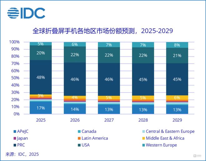 根据IDC统计的数据显示,自2023年起,中国正式超越其他市场,成为全球最大的折叠屏手机市场。今年上半年,中国折叠屏手机出货量达到498万台,同比增长12.6%,占据全球折叠屏48%的市场份额,预计未来五年内,中国市场占全球折叠屏手机市场的比例将稳定在40%以上。