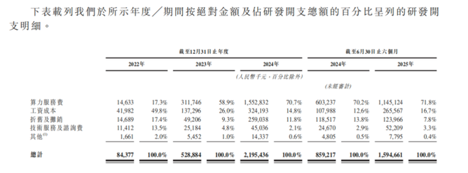 其中,“算力服务费”(包括模型训练以及通过云端部署为客户提供服务)从2022年的0.15亿元到2025年上半年的11.45亿,三年时间飙升到七成以上,并且这些研发成本,均被作为成本损耗计算,“并无将任何研发开支资本化”。