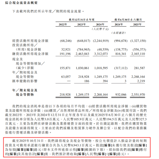 但有人认为上述算法比较粗暴:一是忽略了智谱的营收收益补充,二是忽略了招股书中补充的最新财务信息——综合现金流表下方的一段补充性文字:截至2025年10月31日,我们录得现金及现金等价物、按公允价值计入损益计量的短期投资及可动用承诺银行融资合共为人民币8,943.1百万元。