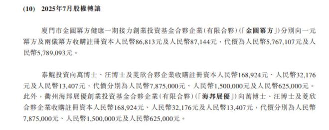 与估值大幅攀升形成鲜明反差的是,凌科药业在IPO前夕出现股东低价转让股权的现象,且同期股权转让价格存在显著差异。招股说明书显示,2025年7月,金圆幂方分别向一元幂方及两仪幂方收购注册资本人民币86,813元及人民币87,144元,代价为人民币5,767,107元及人民币5,789,093元,折合每股66.43元;泰鲲投资向万博士、汪博士及菱欣合伙企业收购注册资本人民币168,924元、人民币32,176元及人民币13,407元,代价分别为人民币7,875,000元、人民币1,500,000元及人民币625,000元,折合每股46.62元;海邦展优向万博士、汪博士及菱欣 合伙企业收购注册资本人民币168,924元、人民币32,176元及人民币13,407元,代价分别为人民币7,875,000元、人民币1,500,000元及人民币625,000元,折合每股46.62元。这意味着在同一时间段内,金圆幂方收购股权的每股价格,比泰鲲投资、海邦展优的收购价高出42.49%,价格差异悬殊,