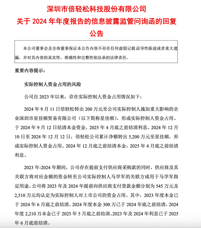 三是存在公司提前支付供应商采购款,随后供应商及其关联方将对应资金转至马学军关联方的情况:2023-2024年期间,公司供应商同样把倍轻松预支付的付款项,提供给实控人马学军相关使用,共计3055万元。