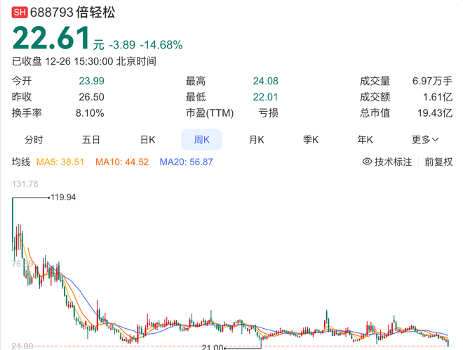 消息公布后,倍轻松股价应声下跌。截至12月26日收盘,公司股价跌14.68%,收报22.61元/股,总市值为19.43亿元。