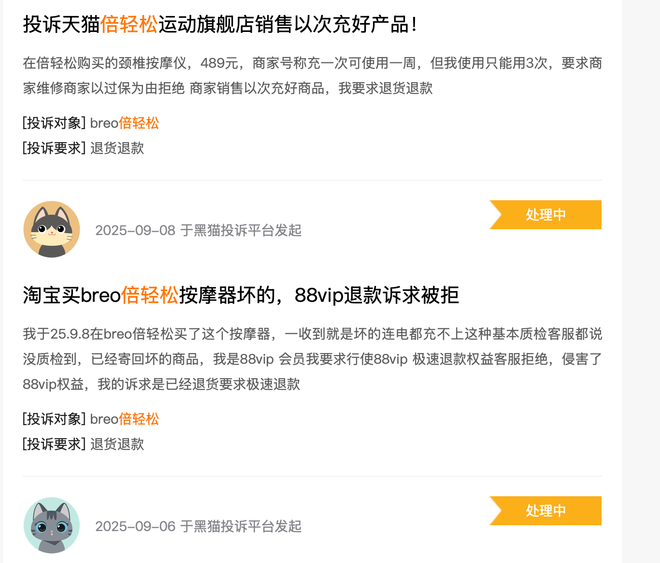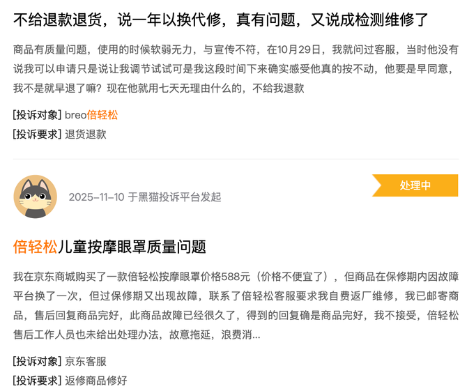 此外,在黑猫投诉平台上,倍轻松的累计投诉量已达288条,问题多集中在产品质量缺陷、售后服务推诿、宣传内容不实等方面,消费者信任度持续被消耗。