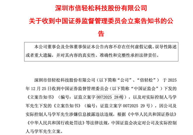 12月25日,“便携按摩设备第一股”倍轻松(688793.SH)一纸公告,将公司与实控人马学军双双推至监管聚光灯下。因涉嫌信息披露违法违规,二者分别收到中国证监会的《立案告知书》。消息如巨石投入市场,激起剧烈震荡。