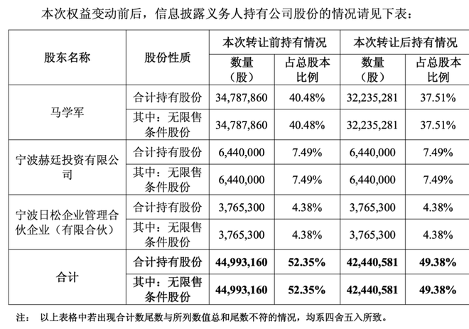 本次权益变动后,马学军及其一致行动人持有的公司股份比例从52.35%下降至49.38%,降至50%以下。天眼查显示,目前马学军持股比例为37.51%。