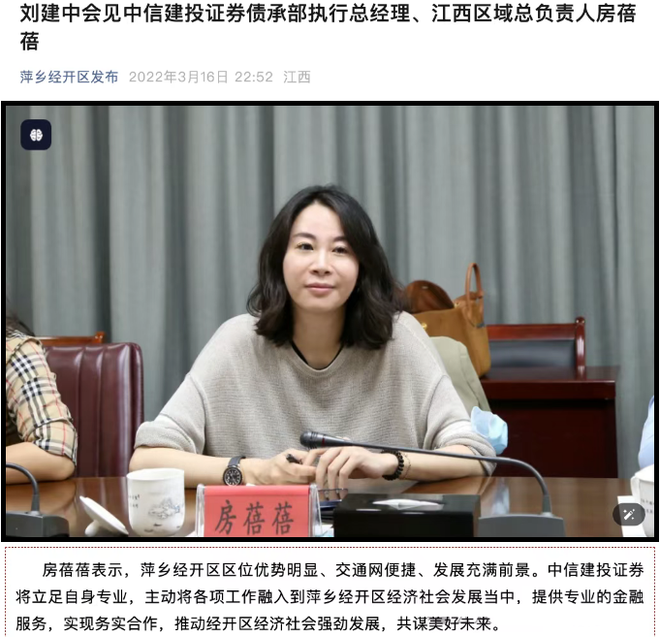 金融圈内,房蓓蓓有“投行第一美女”之称,2015年加入中信建投,一路晋升,2022年的时候已经是执行总经理,负责江西区域业务,是投行部的业务骨干。