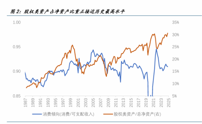 增长的分化直接导致了财富创造和分配机制的失衡。根据国金证券的报告,其分析认为,自2023年初至2025年中,美国居民财富增长的主要来源是企业权益类资产,规模高达约20万亿美元。然而,这类资产的持有高度集中于富裕阶层。