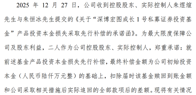 与此同时,圣元环保公告称,下属全资子公司于2025年3月认购由基金管理人发行的私募基金产品进行委托理财,认购本金为6000万元。2025年12月27日,公司收到控股股东、实际控制人朱煜煊先生与朱恒冰先生提交的《关于“深博宏图成长1号私募证券投资基金”产品投资本金损失采取先行补偿的承诺函》。为最大限度保障公司及股东利益,二人作为公司控股股东、实际控制人,郑重承诺:就前述基金产品投资本金损失先行补偿,最终补偿金额为公司初始投资本金6000万元的基础上,扣除届时该基金赎回到账金额和公司采取相关措施后实际追回的全部款项后的差额。