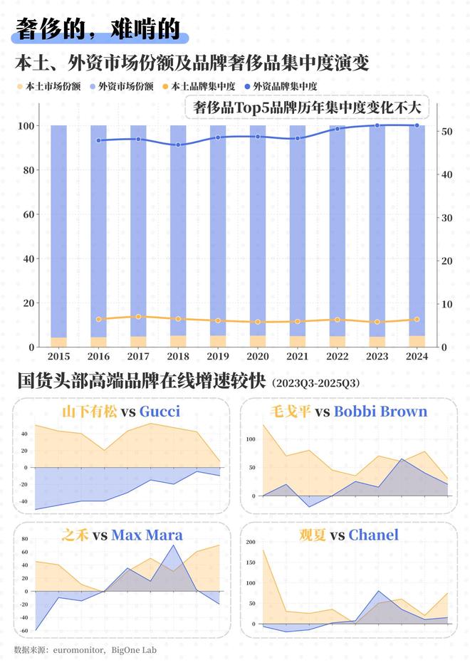 - 昂贵的突围:在奢侈品这块“难啃的硬骨头”上,外资CR10占比高达60.90%,死死守住了95%的市场份额。虽然毛戈平、之禾、山下有松等头部品牌正通过ASP(平均单价)的稳步上移尝试高端化,但在扭转“品牌心智”的惊险跳跃中,国货依然身处客场。