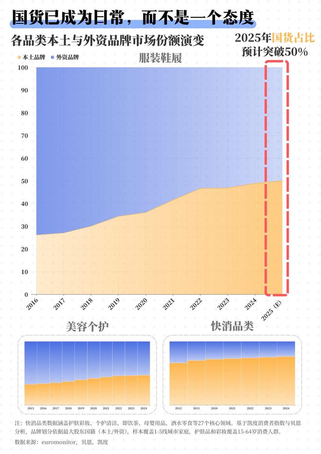 据Euromonitor数据显示,2012年至2024年间,在涵盖护肤、彩妆等27个快消品类中,本土品牌的市场份额已从66%稳步攀升至76%。尤其在服饰鞋履赛道,2025年将迎来一个历史性的分水岭:本土品牌预计将占据50%的江山,正式与外资平分秋色。