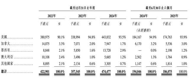 其中,来自美国市场的收入在各期间分别为3.81亿港元、3.39亿港元和4.44亿港元,占总收入九成以上。包括加拿大、墨西哥、澳大利亚在内的其他市场合计占比不足一成。
