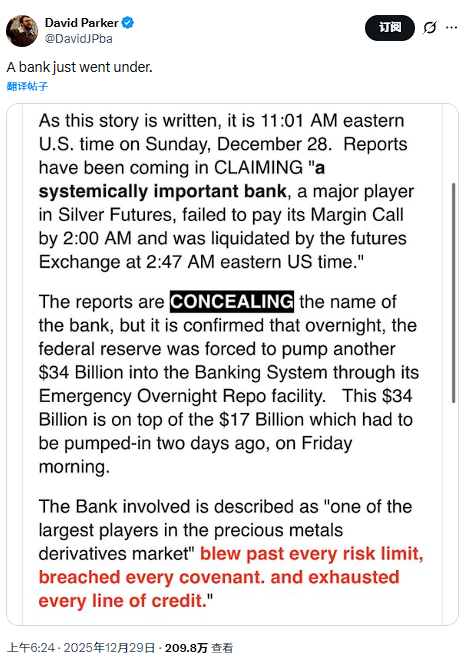 12月29日,社交平台X有用户转发一则报道称,一家在白银期货市场持有重仓空头的大型银行未能在美国东部时间周日凌晨2点前支付追加保证金,并于凌晨2点47分被期货交易所强制清算。报道称,美联储被迫通过紧急隔夜回购机制向银行系统注入340亿美元,这是在周五注入170亿美元之外的额外资金。