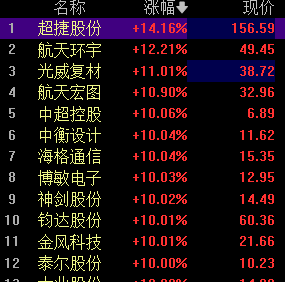 商业航天概念延续强势,鲁信创投4连板,中超控股4天3板,神剑股份、泰尔股份触及涨停,航天发展、航天宏图等跟涨。